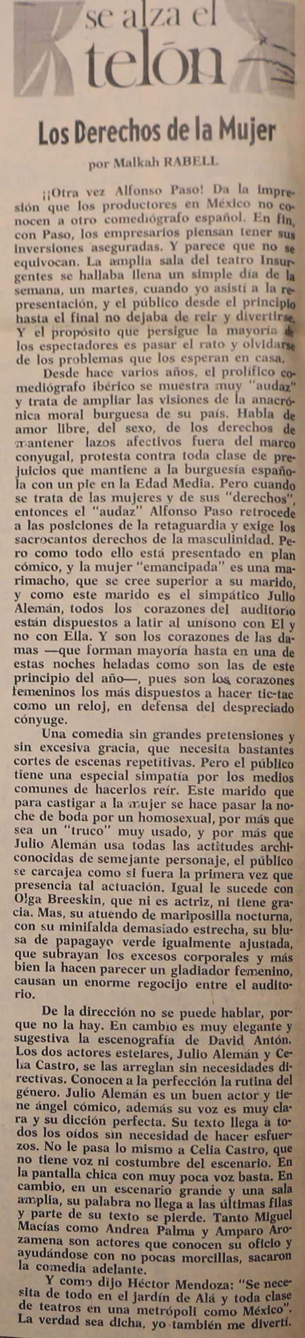 Cómo citar Rabell, Malkah. "Los derechos de la mujer". El Día, 1976. Reseña Histórica del Teatro en México 2.0-2.1. Sistema de información de la crítica teatral, <criticateatral2021.org>