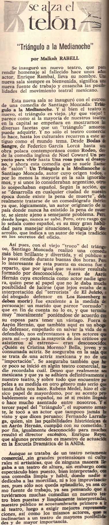 Esta nueva sala se inauguró con el estreno de una comedia de Santiago Moncada: Triángulo a la medianoche. Y si bien el teatro es nuevo, el triángulo es viejo. ¡Ay que viejo! Y parece como si la mayoría de nuestros teatros en la capital se empeñara en mostrarnos las diversas facetas que un "triángulo" amoroso puede adquirir. Y no sólo el teatro comercial lo hace, hasta los culturales recurren a este antiguo como el mundo tema. Desde Bodas de sangre, de Federico García Lorca hasta una obra polaca contemporánea como Rodeo, de la comedia inglesa de Noel Coward Un proyecto para vivir hasta Una rosa para el desayuno, y ahora esta comedia que se suele llamar de "salón": Un triángulo a la medianoche de Santiago Moncada, autor cuyo origen todos, por lo menos la mayoría en la sala ignorábamos, y si unos lo consideraban argentino, otro lo sospechaban español. Según la acción, que se "desarrolla en cualquier ciudad de nuestra época donde existe la pena de muerte", debe realmente tratarse de un comediógrafo ibérico ya que, lógicamente, un autor originario de un país donde nunca ha existido la pena de muerte, se siente ajeno a semejante problema. Pero desde luego, nunca se sabe. Pero, otro rasgo que lo señala como español, es su muy gran habilidad para manejar situaciones, lenguaje y desarrollo, que indica a un autor de vieja tradición en los secretos del oficio.